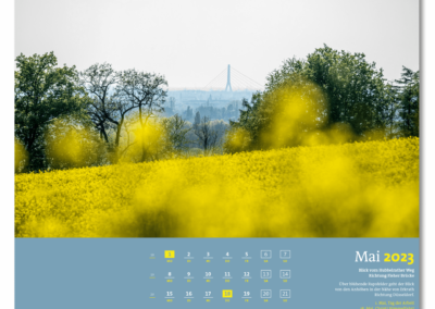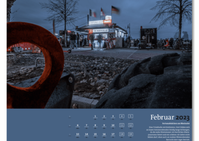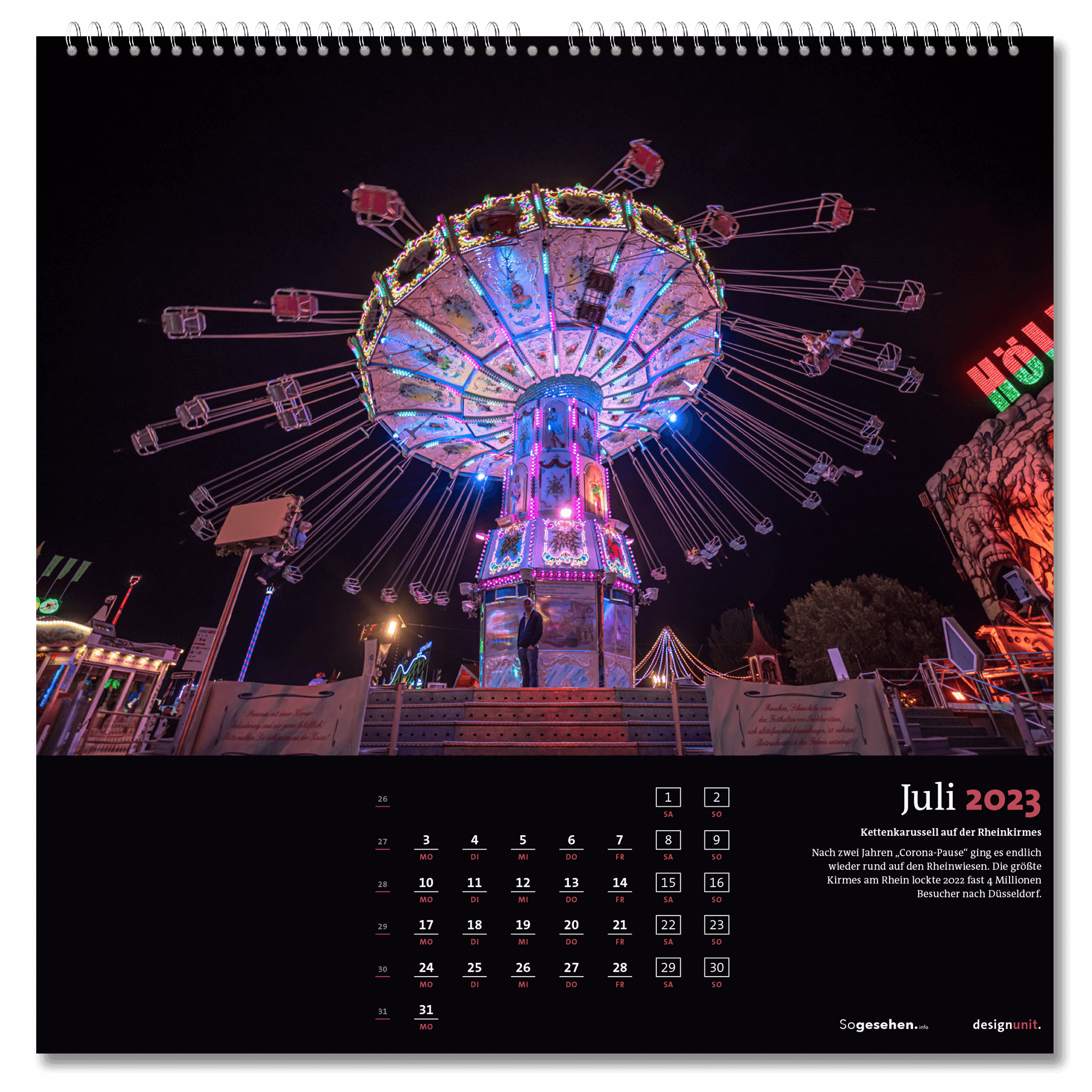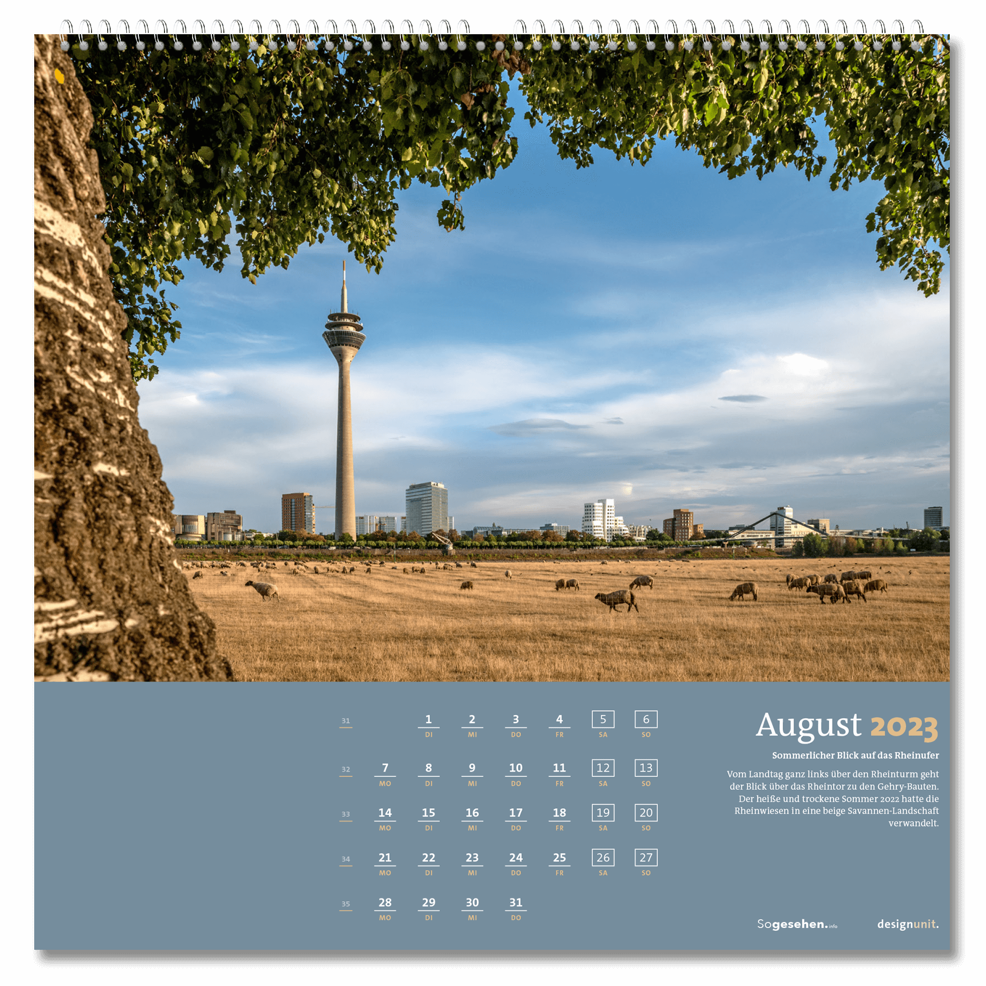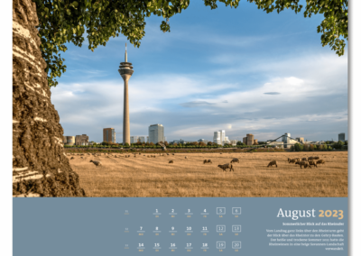 Im Juli feiern wir die erste wieder stattfindende Kirmes am Rhein nach zwei Jahren Zwangspause. Der trockene und heiße Sommer bildet die Kulisse für das Augustmotiv unseres Kalenders. Über die vertrockneten Rheinwiesen auf der eine Schafherde grast, geht der Blick zum Medienhafen. Eine ungewöhnliche Ansicht vom Fortuna-Büdchen gibt es im Februar zu sehen. Im Mai gehen wir ganz weit vor die Tore Düsseldorfs um aus der Ferne über ein Meer von Raps auf unsere schöne Stadt zu schauen. Ein Ort, den wir jedem gerne ans Herz legen, ist die Terrasse der Tonhalle. Diese bildet den Vordergrund des Septembermotivs. Dort kann man bei einem Gin-Tonic ganz entspannt der Sonne beim Untergehen zuschauen.