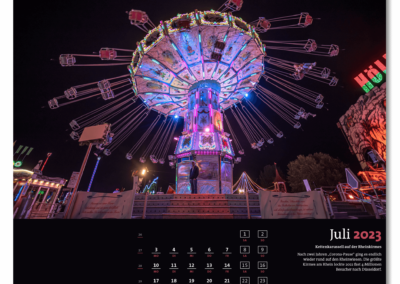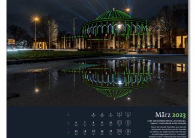Bereits auf dem Cover unseres aktuellen Kalenders gibt es Düsseldorf satt. Der Schlossturm am Burgplatz gemeinsam mit dem Riesenrad und den Säulenheiligen auf der Füchschen-Litfass-Säule – mehr Düsseldorf geht kaum. Entstanden ist diese Aufnahme am „Orange Day“, dem Internationalen Tag gegen Gewalt an Frauen, der Ende November 2021 zum ersten Mal in Düsseldorf stattfand. Wir haben diese Mal versucht nicht nur ungewöhnliche Perspektiven zu finden, sondern auch einmalige Ereignisse festzuhalten. So findet sich zum Beispiel im März eine Aufnahme von der Multimedia-Aktion „Trans-Europa-Express“ vor dem NRW-Forum, bei der zu den Klängen von Kraftwerk eine Lichtshow auf die Tonhalle projeziert wurde.